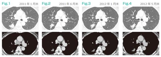案例:60歲女性 無吸煙史 2011年1月診斷為T4N3M1a肺腺癌(肺內及鎖骨上淋巴結轉移)。2011年3月初開始CDDP+PEM+BV化療,并切除了右鎖骨上淋巴結,將切除淋巴結溶解制作DC疫苗,以待后用。至6月,CDDP+PEM+BV治療4次,細胞療法3次,發現腫瘤縮小(PR),隨機停止聯合化療,7月開始維持治療僅使用貝伐+細胞療法,觀察至2015年5月底腫瘤未進展。