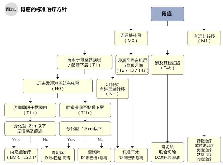 日本胃癌學(xué)會(huì)編纂的《胃癌治療指南Guide Line》把有無(wú)遠(yuǎn)處轉(zhuǎn)移用M0和M1表示,浸潤(rùn)深度用T1a~T4b表示,有無(wú)淋巴結(jié)轉(zhuǎn)移用N0和N+表示,確定分期后再根據(jù)癌細(xì)胞的類型(分化型,未分化型)、腫瘤的大小,采用不同的標(biāo)準(zhǔn)治療。