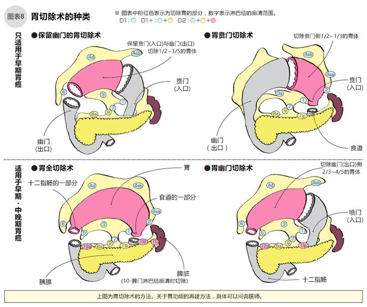 縮小手術(shù)中有保留幽門的胃切除術(shù)(腫瘤在胃的中部),也有切除賁門(腫瘤在賁門附近)保留其他部分的胃賁門切除術(shù)等。保留幽門的胃切除術(shù)切除距賁門1/3到距幽門4~5cm的胃,然后將殘余胃縫合(吻合)(8圖)。胃賁門切除術(shù)切除賁門及賁門到胃體1/3到1/2的部分,然后將食道和殘余部分縫合,或者在食道和幽門之間加入10cm長(zhǎng)的空腸(如圖8右上)。如果縮小手術(shù)的切除范圍足夠精確,其治療效果與標(biāo)準(zhǔn)手術(shù)(胃全切)是一樣的。