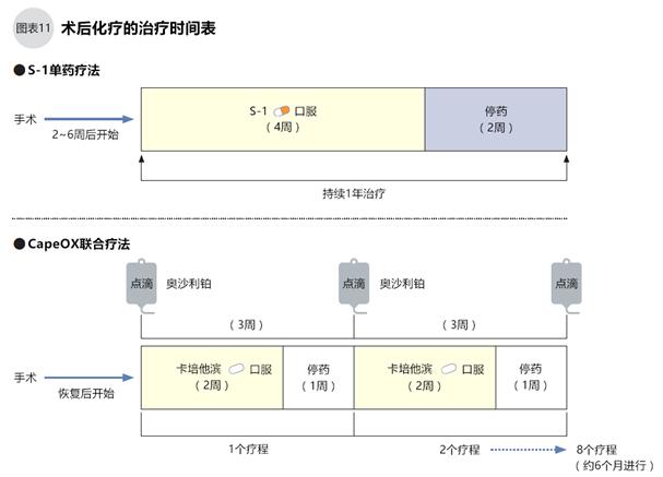S-1單藥治療從術(shù)后恢復(fù)期的2~6個(gè)星期內(nèi)開始,每日口服,連續(xù)復(fù)用4周后停藥2周為1個(gè)療程,持續(xù)治療8個(gè)療程(約1年)。CapeOX聯(lián)合方案的治療從手術(shù)恢復(fù)后開始,卡培他濱每日口服,連續(xù)服用2周后休藥1周,口服卡培他濱后間隔1天點(diǎn)滴1次奧沙利鉑,3周為一個(gè)療程,持續(xù)治療8個(gè)療程(約6個(gè)月),如圖11。在術(shù)后輔助化療期間,患者須配合醫(yī)生隨訪,每2~4周面診一次,化驗(yàn)血液等以判斷手術(shù)和藥物的副作用。另外6~12個(gè)月進(jìn)行一次CT影像檢查,檢查復(fù)發(fā)。