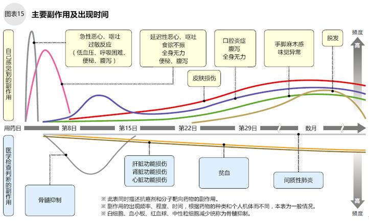 副作用的出現(xiàn)方式(癥狀、時(shí)期、時(shí)間段、頻度、程度等)因抗癌劑的種類和個(gè)體差異有所不同(圖15)。傳統(tǒng)細(xì)胞毒性抗癌劑通過抑制癌細(xì)胞的增殖以期望達(dá)到抗癌效果,但是其容易傷害分裂活躍的毛根細(xì)胞、骨髓細(xì)胞、胃黏膜細(xì)胞、生殖細(xì)胞等,因此上述部位容易出現(xiàn)副作用。一般情況下,治療胃癌的抗癌劑容易引起的副作用主要有消化道癥狀(食欲不振、惡心、嘔吐、腹瀉等)、骨髓抑制(白細(xì)胞減少、血小板減少、貧血等)、口腔炎癥、脫發(fā)、疲倦感等。不同的藥物有不同的副作用,比如S-1或卡培他濱容易出現(xiàn)流淚、手足綜合征、皮膚色素沉著的癥狀;紫杉醇和多西他賽容易出現(xiàn)過敏性癥狀。