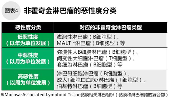 非霍奇金淋巴瘤的類型非常多,按腫瘤發展的速度分為3類(圖4):低惡性度(以年為單位進展)、中惡性度(以月為單位進展)、高惡性度(以周為單位進展)。惡性度表示腫瘤的性質,是在不治療的情況下評估其發展速度的。惡性度與分期一樣重要,也是選擇治療的指標之一。