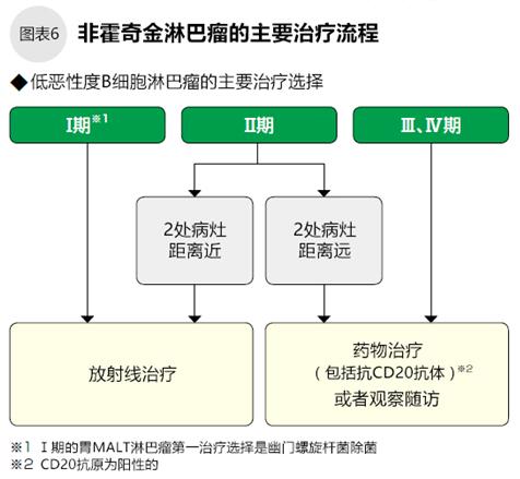 濾泡性淋巴瘤和MALT *淋巴瘤等低惡性度B細胞非霍奇金淋巴瘤,分期為Ⅰ期或Ⅱ期,且2個病灶距離近的,可進行放射線治療;分期為Ⅱ期,且2個病灶距離遠的,或Ⅲ期、Ⅳ期的,以藥物治療和隨訪觀察為主(圖6)。Ⅰ期的胃部MALT淋巴瘤優先考慮幽門螺旋桿菌除菌治療,有很多患者只行除菌治療就可以控制住腫瘤。