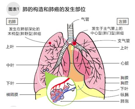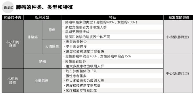 作為空氣通道的氣管、支氣管、以及氣體交換場所的肺泡細胞,在某種原因下可能發(fā)生癌變。從肺癌發(fā)生部位分,肺入口附近的主氣管發(fā)生癌變的稱為中心型(肺門型)肺癌,肺的深處發(fā)生癌變的稱為末梢型(肺野型)肺癌;從組織分型上有“非小細胞肺癌”(腺癌、鱗癌、大細胞癌)和“小細胞肺癌”,其性質(zhì)、發(fā)展、治療方法和治療效果各不同(圖2)。肺癌中約85%為非小細胞肺癌,其中最多的是腺癌。