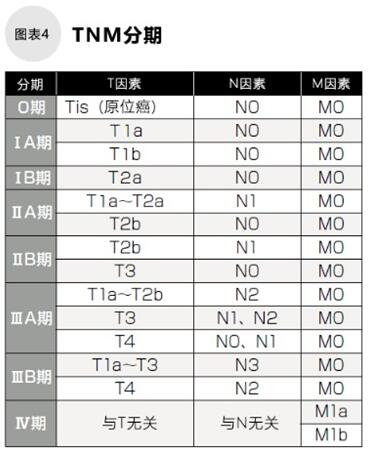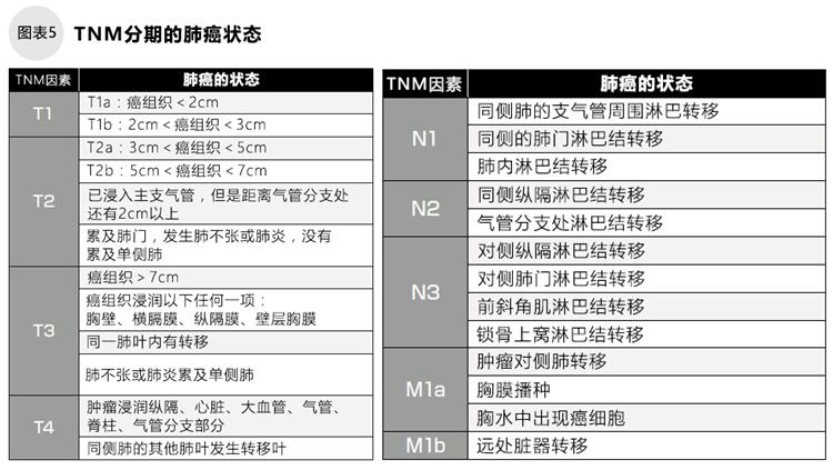 根據(jù)這三個因素可將肺癌細分為8個分期:0期、ⅠA期、ⅠB期、ⅡA期、ⅡB期、ⅢA期、ⅢB期、Ⅳ期(圖4、5)。越接近0期癌組織越小范圍越局限,約接近Ⅳ期癌組織越大,擴散程度越大(圖6)。