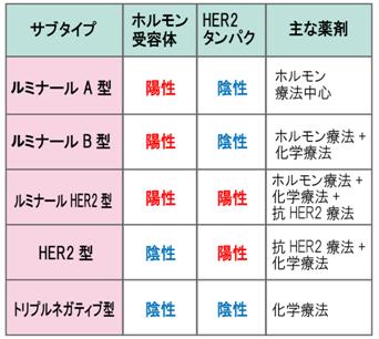 然而,近年來重要的是稱為“ 亞型 ”的分類。乳腺癌亞型主要分為5種,取決于激素受體的陽性/陰性,稱為HER2的蛋白質陽性/陰性。通過這種分類,我們將決定化療(抗癌藥物治療),HER2治療(分子靶向治療)和激素治療等手段與手術一起進行。