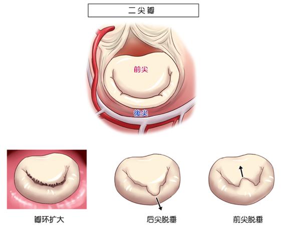 二尖瓣功能障礙,發生異常主要有三種形式:瓣環擴大、后尖脫垂、前尖脫垂三類。