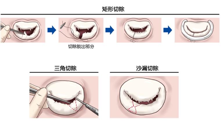 二尖瓣的后尖脫垂,多數情況需要行瓣環形成術和后尖切除術并用。瓣尖切除瓣膜上脫垂的部分,然后縫縮,使后尖恢復功能。在瓣膜的切除手法中,根據瓣膜的形狀有矩形切除、三角切除和沙漏切除。