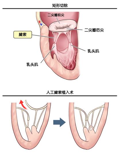二尖瓣的的前尖脫垂,用矩形切除很難修復瓣膜。因此,不是修建瓣膜的形狀,而是移植和調整鏈接前尖和心肌的腱索,腱索就像一跟彈簧繩拉動前尖的閉合,這樣可以改善二尖瓣關閉不全。