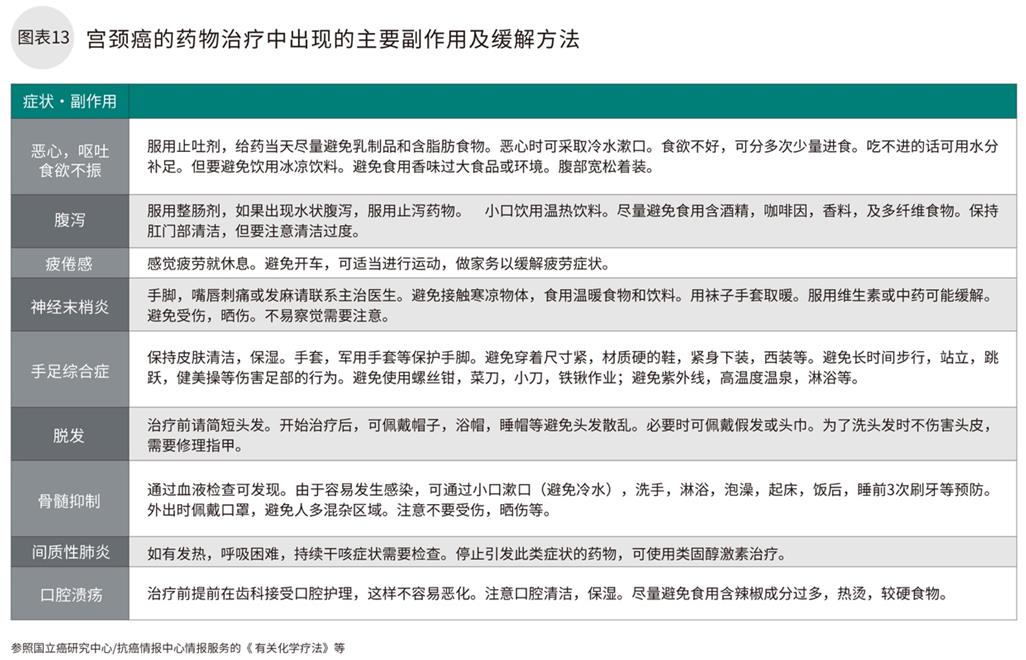 自覺癥狀中最有代表性的就是惡心和嘔吐。通常提前服用止吐劑來控制。如果有手腳麻木,疼痛,浮腫等神經(jīng)末梢炎癥狀以及手足綜合癥,則需要盡早治療。圖表13中將各種癥狀的緩解方法羅列出來了。不管發(fā)生什么副作用,提前知曉一般都可以緩解。盡可能避免中斷或終止治療。