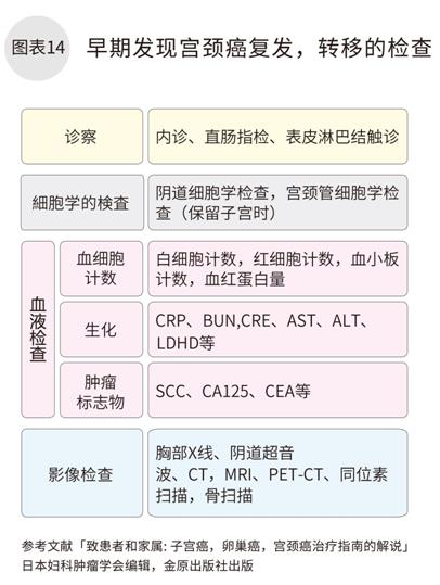 宮頸癌的復發(fā)約80%~90%發(fā)生在治療后的5年內(nèi),5年后也有可能復發(fā)。大多數(shù)為盆腔內(nèi)復發(fā),而淋巴結(jié),肺,肝臟,骨等遠處轉(zhuǎn)移也容易發(fā)生。因此治療后前3年內(nèi)每1~3個月,第4~5年每6個月,第6年開始每年1次需要進行定期隨訪檢查(圖表14)。