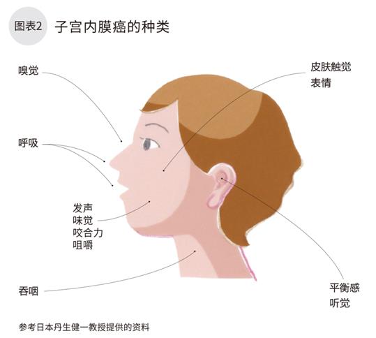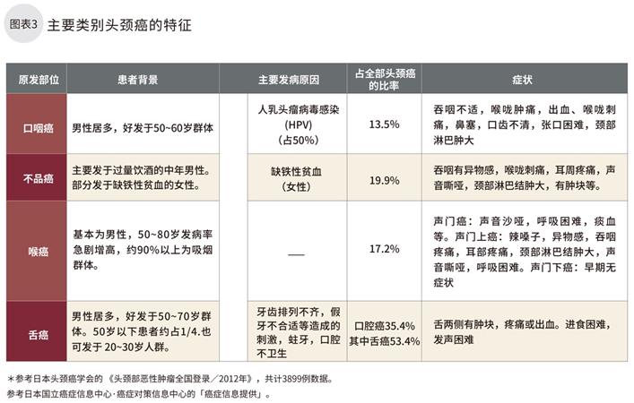 頭頸部有維持面部形態,生成表情等管理頜面的功能,集中了人體呼吸,進食(咀嚼,吞咽),發聲,味覺,嗅覺,聽覺等維持生命和進行社會生活的重要器官和生理功能(圖表2)。因此一旦患有頭頸部腫瘤,根據腫瘤發生的部位不同,會出現腫痛,出血,吞咽困難,聲音嘶啞,發聲困難等癥狀,會對患者日常生活產生各種障礙,大幅降低生活質量。
