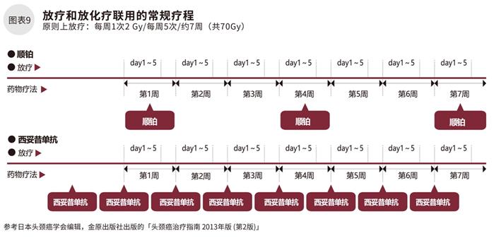 主要以放療作為根治療法的頭頸癌有:鼻咽癌,口咽癌,早期聲門癌,全喉切除的晚期喉癌,下咽癌,鼻竇癌,副鼻竇癌,無法手術切除的癌等。通常治療療程為每天1次2 Gy,每周5次,約7周(共70Gy)。必要時實施放化療聯合(圖表9)。另外,手術效果不好,或需要緩解疼痛時也可使用放療。