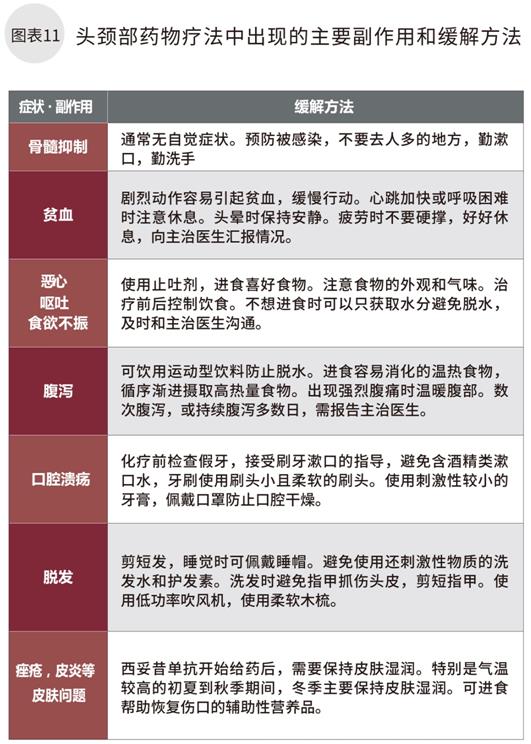 頭頸癌的治療中,在手術、放療前可先使用藥物療法,或者與手術或放療同時進行。也可用于初次治療后的維持性療法,或發生復發,轉移時的治療。對于有可能引起的副作用,需要介入預防手段,或可緩解副作用癥狀的方法。