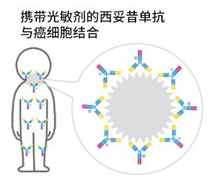 初期我們發(fā)現(xiàn),通過給光敏劑IRDye® 700DX照射近紅外線的方法可以破壞癌細(xì)胞。為了將光敏劑IRDye® 700DX送達(dá)癌細(xì)胞,需要在可以選擇性地和癌細(xì)胞特異蛋白結(jié)合的抗體中加入光敏劑IRDye® 700DX。尚在臨床試驗中的藥物ASP-1929,就是在可以選擇性地與表皮生長因子受體(EGFR)結(jié)合的表皮生長因子抑制劑--西妥昔單抗中加入光敏劑IRDye® 700DX制作而成的。