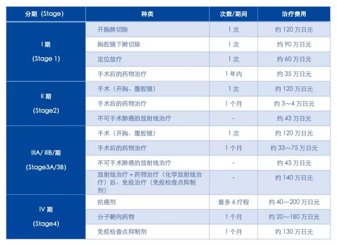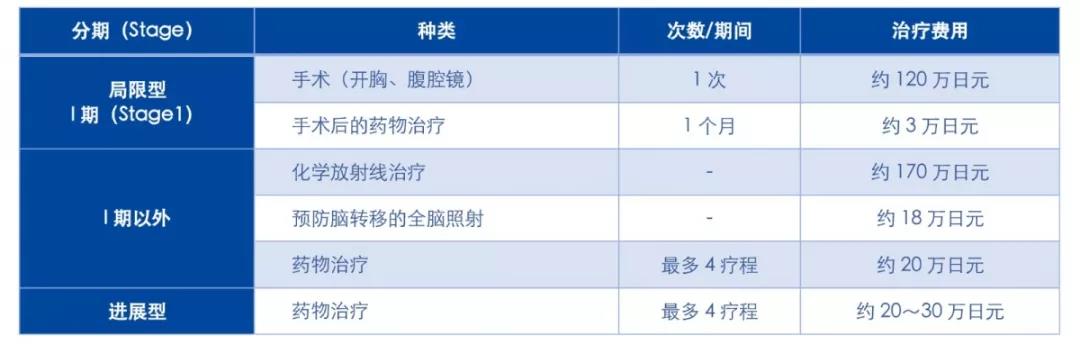 在日本,肺癌的醫療費用包括治療費(藥費、注射費、手術費、其他治療費)、住院費、常規檢查費、影像診斷費用等。其中,治療費所占的比例最大。下面將根據肺癌的種類、分期(Stage),介紹日本肺癌治療的大致費用。以下治療費用為已經加入日本社會醫療保險的治療費用,外國患者的治療費用根據日本各醫院外國患者接受規定,通常是2-3倍,收費標準略有差異。
