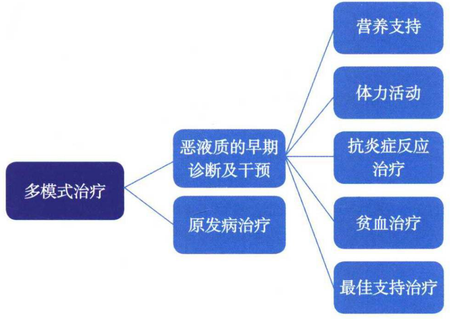 當前,針對腫瘤惡液質仍然缺乏積極的治療手段。一方面,臨床醫生多數缺乏臨床營養學方面的知識及對營養不良重視程度不夠;另一方面, 由于缺乏針對腫瘤惡液質患者開展的大樣本臨床研究,導致相關的治療措施缺乏足夠的循證醫學(evidence-based medicine)證據。值得注意的是,研究發現許多藥物對于改善惡液質狀態具有一定益處,但是惡液質是由多因素引起的綜合征,單一的藥物及治療方法的療效非常有限。因此,近幾年提出了多模式治療(multimodal therapy)的概念。多模式治療需要多學科團隊的共同努力,要求臨床醫生能夠在惡液質發生的早期進行診斷及干預,針對原發病進行治療的同時,給予患者必要的營養支持、適度的體力活動、抗炎癥反應治療、貧血治療以及其他可能的最佳支持治療(圖)。