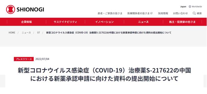 鹽野義制藥公司研發的治療新冠病毒的口服藥物。藥物開發編號:S-217622