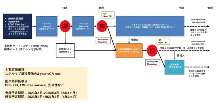 坂東英明教授和他的同事還在進行 VOLTAGE-2 研究,這是一項由研究者發起的臨床試驗。該試驗對 MSI-H局部晚期直腸癌患者在標準治療前每兩周給予納武單抗 240 mg,持續 12 個周期,達到 cCR 的患者在不手術的情況下繼續接受納武單抗治療。而對于有腫瘤殘留的病例在實施放化療后根據cCR有無來決定手術(圖)。