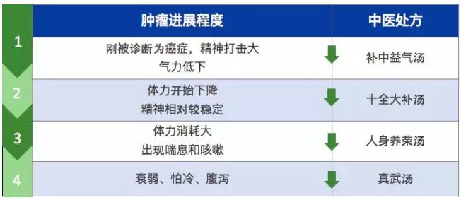 最具代表性的補藥是十全大補湯和補中益氣湯,人參養榮湯也是癌癥患者經常服用的補藥。下表按癌癥的進展程度舉例推薦一些中醫藥劑。
