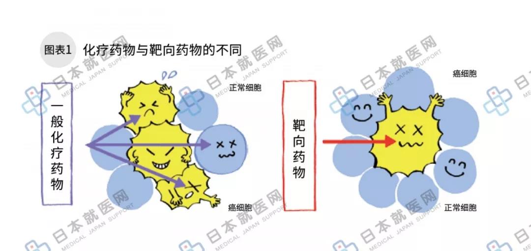 癌細胞具有持續增殖的性質。醫學和遺傳工程學的進步使人們發現了各種各樣的分子(蛋白質、基因)與癌的增殖有關。分子靶向藥物狙擊這些特定的分子,妨礙或破壞癌細胞的增殖。相對化療藥物不僅破壞癌細胞也破壞正常細胞,靶向藥物的破壞癌細胞的聚焦能力更強(圖表1)。人們開發的首款靶向藥物是曲妥珠單抗,于1998年在美國首先得到認可,用于HER2蛋白陽性的乳腺癌轉移復發病人。這款藥物在開發過程中多次中斷,后來在患者援助社會團體的支持下誕生。后來發現,HER2陽性的乳腺癌病人在術后用該藥和化療一樣,可以有效控制復發。繼而在2001年美國又承認了用于治療慢性骨髓行白血病(CML)的靶向藥物伊馬替尼。更多的CML的病人可以正常工作、家務、育兒了。