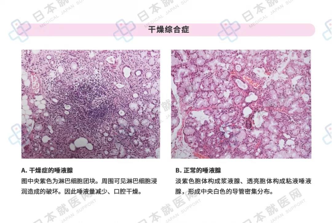 淚腺損傷后發生干眼癥,唾液腺損傷后口腔干燥都是干燥癥的癥狀。進一步,淚腺和唾液腺之外的外分泌腺也會發生慢性炎癥。該病可以檢測出類風濕因子或核蛋白,同時與其他自勉病合并發生的也很多。干燥癥的具體病因不明,推測與B細胞的活性過強有關。