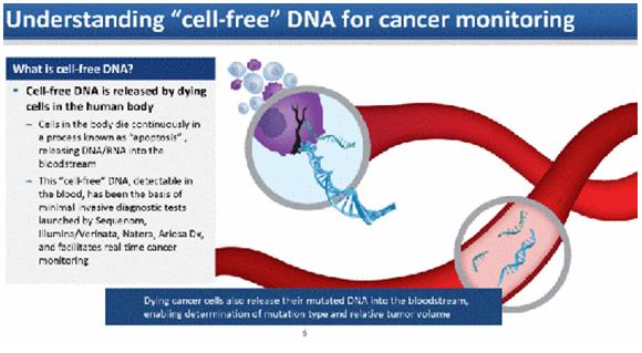 細胞凋亡時, cfDNA會從細胞中釋放到血液中。健康人的血液中也會檢測到cfDNA,但健康人與癌癥患者的DNA甲基結構有所不同。即癌細胞會釋放一種特定的cfDNA,而且不同癌細胞所釋放的cfDNA會有不同的甲基結構。因此, 通過分析cfDNA的甲基結構,可以辨別癌細胞。