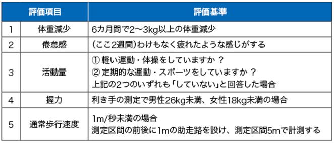 伴隨老齡化的發展,該比例逐年增加。根據日本心血管健康研究(J-CHS)的標準,具備以下5個評估項目中的3個,即可診斷為老年衰弱綜合征。(參考圖表2)
